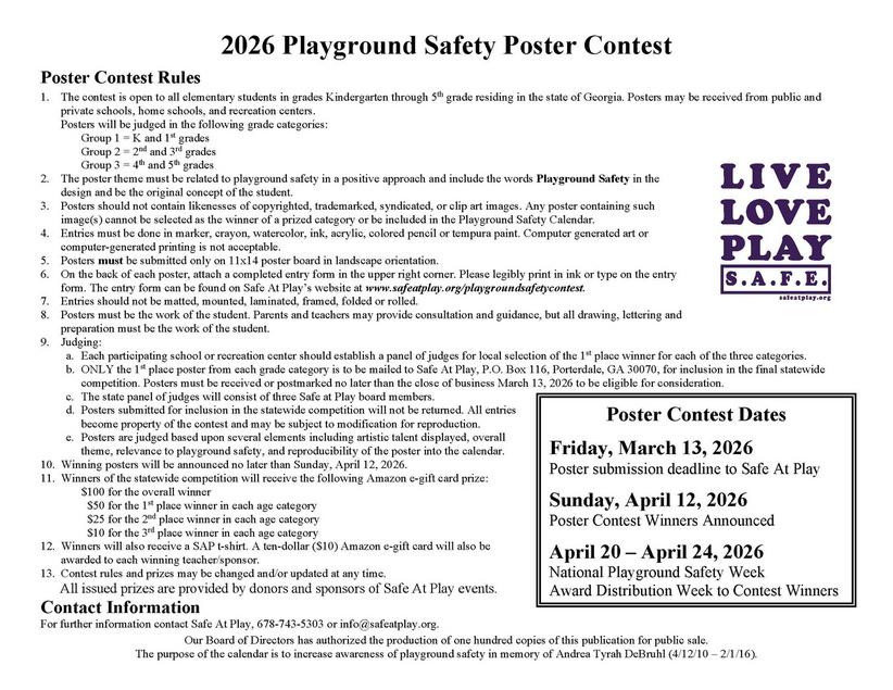 We are pleased to announce our 9th Annual Playground Safety Poster Calendar Contest. This contest is open to all Georgia elementary students in grades Kindergarten through 5 residing in the state of Georgia.